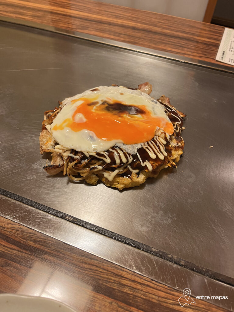 Este plato típico de la región de Kansai consiste en una especie de tortita hecha con harina, huevo y repollo y a la que se le añaden los ingredientes más variados, para cocinarla en una plancha. Es súper popular, pero es que está muy rica.