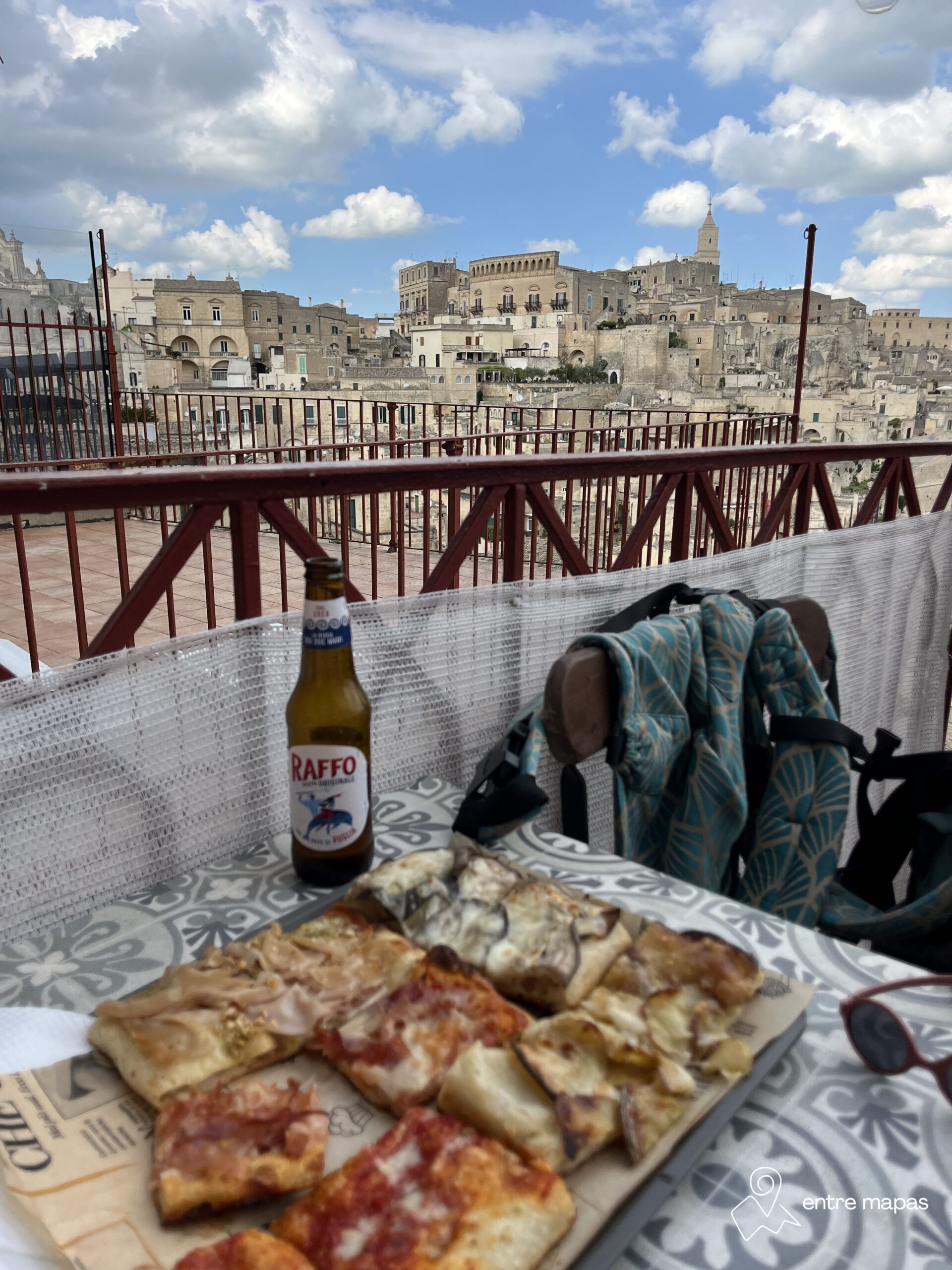 - Y, por último, la joya de la corona. La pizzería 5 Lire te espera con sus vistas de infarto. Aquí podrás comer porciones de pizza con, probablemente, una de las mejores vistas de Matera.